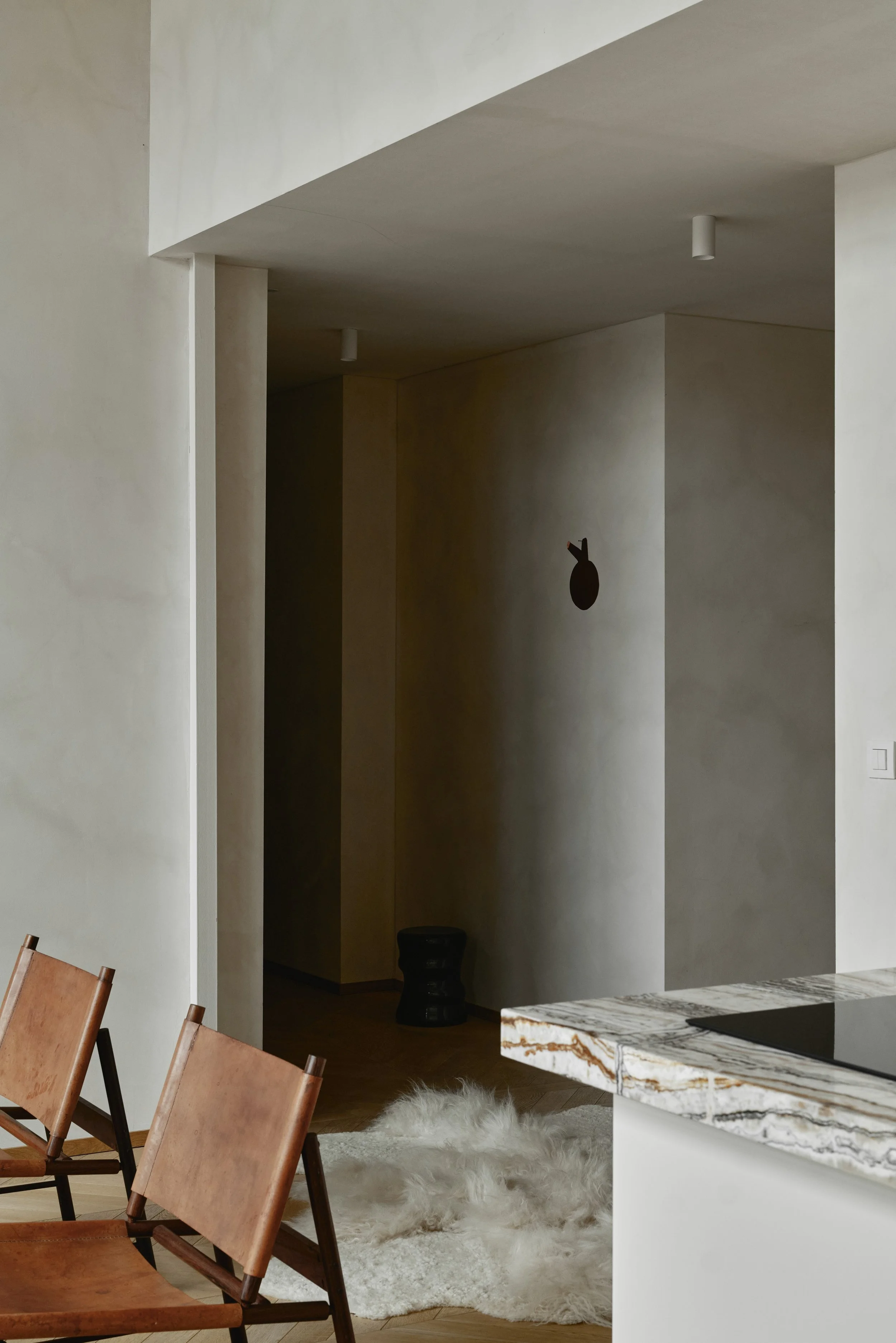Flax Factory Loft is a minimal residence located in Kortrijk, Belgium, designed by Leire & Deklerck. Spanning 140 square meters, this home epitomizes spacious modern living. The design ethos harmoniously blends industrial elements with a cozy, natural ambiance, achieved through a thoughtful interplay of shapes and materials. Central to the loft’s design is the herringbone pattern in the parquet flooring, which echoes the geometric lines of the trusses that span the residence. This architectural feature adds a distinct character to the space, creating a visual dialogue between traditional and modern design elements. The living area, considered the hub of the loft, is anchored by a kitchen island that stands as a functional and aesthetic focal point. The travertine stone, in a subdued brownish-gray hue, integrates seamlessly into the overall design palette, complementing the industrial backdrop.